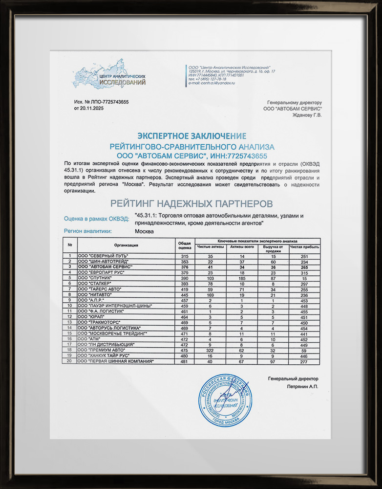 По результатам ежегодного экспертного анализа, проводимого Центром аналитических исследований в рамках программы «Лучшее предприятие отрасли 2025», компания «BS-Tyres» включена в Рейтинг надёжных партнёров.